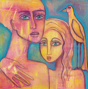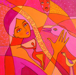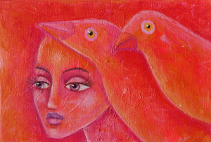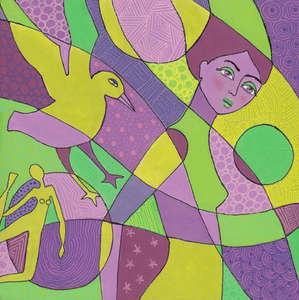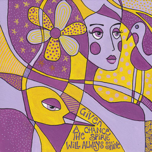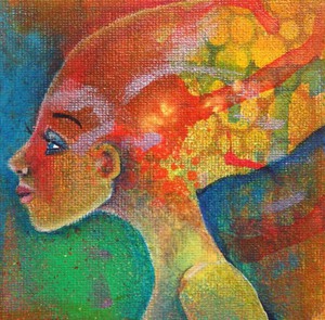 2012Intuitief schilderijtje met acryl, waterverf and inkt. Beschermd met enkele laagjes vernis. De kanten zijn meebeschilderd, zodat het klaar is om op te hangen.